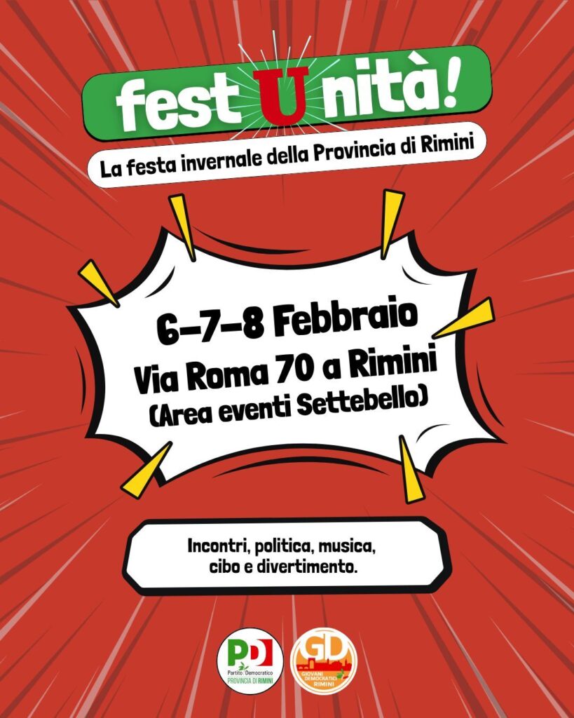 Dopo oltre 10 anni anni torna “Fest’Unità, la festa invernale della provincia di Rimini”: appuntamento fra il 6 e l’8 febbraio all’Area Eventi Settebello per tre giorni di incontri, politica, musica e divertimento. Fra gli ospiti Pier Luigi Bersani, Benedetta Scuderi, Virginia Libero, Stefano Bonaccin, Dario Nardella, Cecilia Guerra, Armando Spataro, gli amministratori del territorio, segretari, assessori, consiglieri regionali e parlamentari Dem