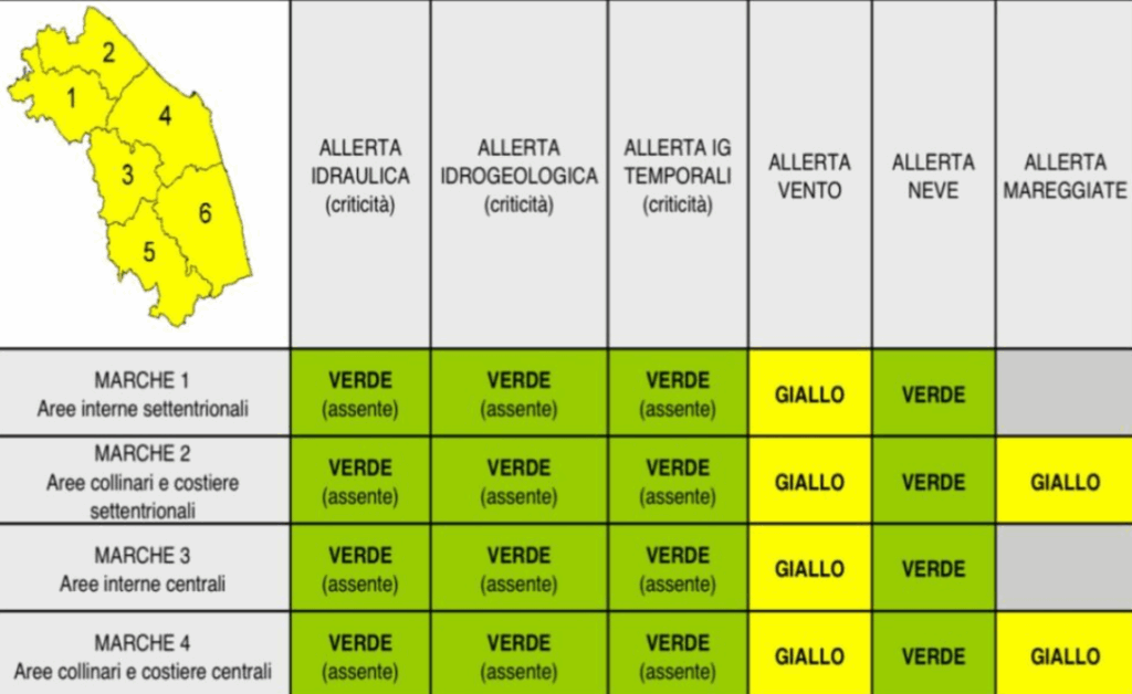 Il calo delle temperature farà abbassare la quota neve intorno ai 1500 metri, senza significativi accumuli. La ventilazione da nord-est, invece, è attesa in netto rinforzo: vento moderato o teso interesserà non solo la costa e il crinale appenninico, ma anche le zone interne del settore centro-settentrionale, con raffiche che localmente potranno raggiungere la burrasca.