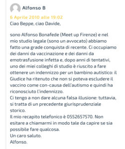 Vedete questo post? Sta circolando in questi giorni sui social. Risale al 2010, l’epoca in cui il ministro della Giustizia, Alfonso Bonafede, era un semplice attivista del Movimento 5 stelle. E indovinate di cosa si vantava con Beppe Grillo? Di aver avviato una battaglia sui “danni da vaccinazione” e di aver avuto un “collega di studio” legale che era riuscito a “far ottenere un indennizzo per un bambino autistico”.