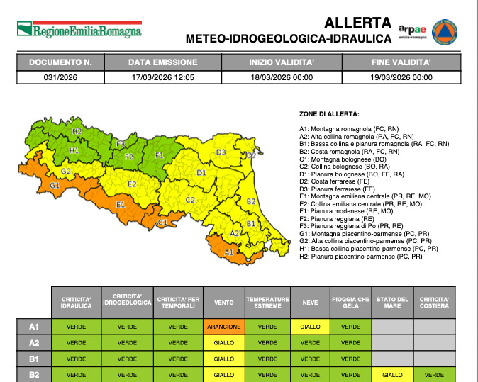 Nella giornata di mercoledì 18 marzo sono previsti venti di burrasca forte (75-88 Km/h) da nord-est sul crinale appenninico, con temporanei rinforzi o raffiche di intensità superiore. Sul settore centro-orientale, nelle aree collinari e sulla fascia costiera si prevedono inoltre venti di burrasca moderata (62-74 Km/h) da nord-est, con temporanei rinforzi o raffiche di intensità superiore. Nella mattinata sono previste nevicate di debole/moderata intensità (15-30 cm) a quote attorno ai 700-800 metri, con temporaneo interessamento anche delle aree a quote inferiori. Nel pomeriggio la quota neve è prevista in rialzo a 1000-1100 metri sull’Appennino orientale e a 900-1000 metri su quello emiliano. È previsto mare al largo da molto mosso ad agitato e sottocosta non si escludono localizzati fenomeni di erosione dei litorali.