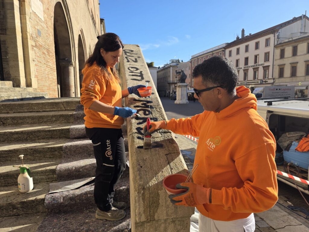 Sono in corso, da questa mattina, i lavori di pulitura e restauro della scala esterna che collega Palazzo del Podestà e Palazzo dell’Arengo, deturpata da scritte offensive nella notte tra domenica 28 e lunedì 29 settembre scorsi. L’intervento dovrebbe concludersi in giornata.