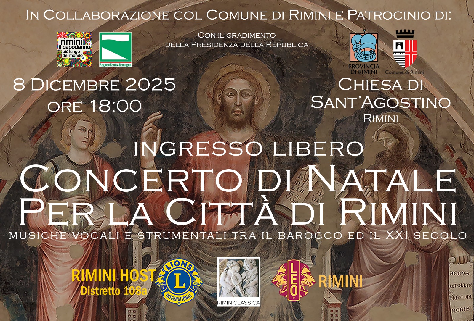 Un appuntamento che unisce l’eccellenza musicale alla solidarieta’ concreta, diventato ormai una tradizione irrinunciabile per la citta’. Lunedi’ prossimo, 8 dicembre, la chiesa di Sant’Agostino in via Cairoli aprira’ le sue porte all’ottava edizione del “Concerto di Natale per la Citta’ di Rimini”. L’evento, promosso dal Lions Club Rimini Host ETS con il gradimento della Presidenza della Repubblica, e’ stato presentato oggi come un momento di alta cultura ma, soprattutto, come un gesto di vicinanza ai piu’ fragili.