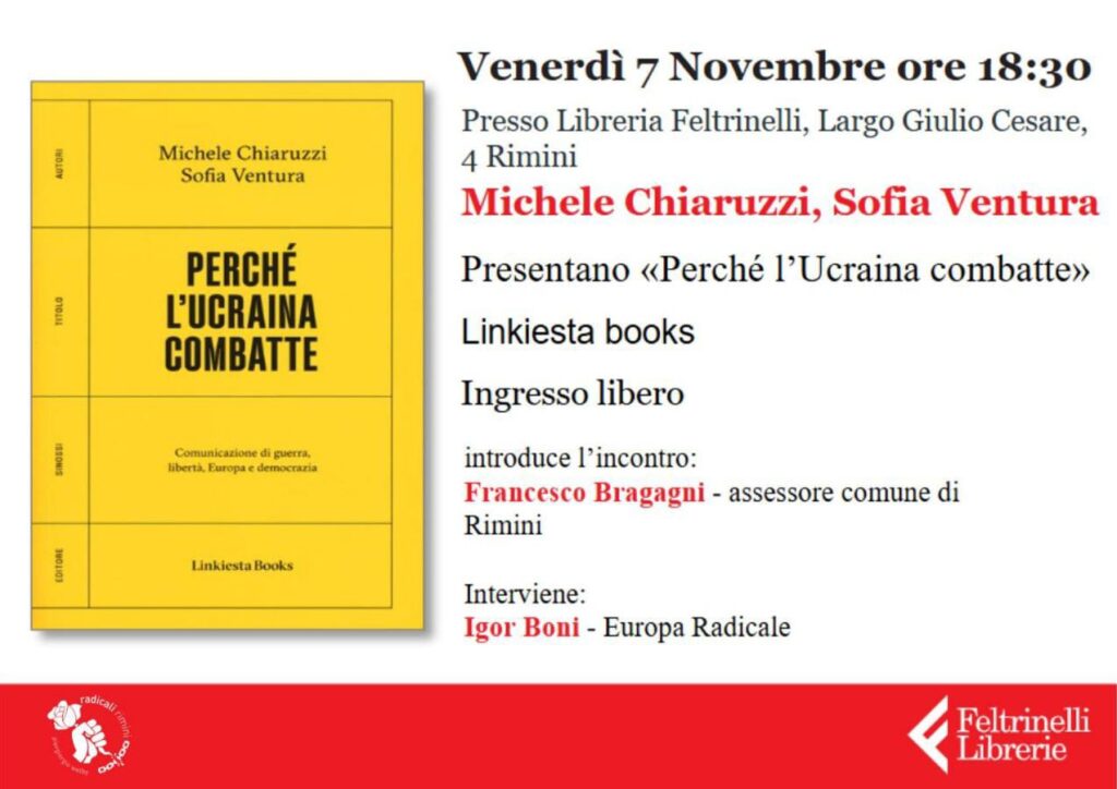 Un’analisi della resistenza ucraina che va oltre i campi di battaglia per esplorare la lotta culturale, mediatica e identitaria contro l’aggressione russa. È questo il cuore del saggio “Perché l’Ucraina combatte” (Linkiesta Books, 2025) che sarà presentato venerdì 7 novembre, alle 18.30, alla libreria Feltrinelli di Rimini, in Largo Giulio Cesare 4. A discuterne con il pubblico, a ingresso libero, saranno gli autori Michele Chiaruzzi e Sofia Ventura. L’incontro sarà introdotto dall’assessore del Comune di Rimini, Francesco Bragagni, e vedrà l’intervento di Igor Boni di Europa Radicale.
