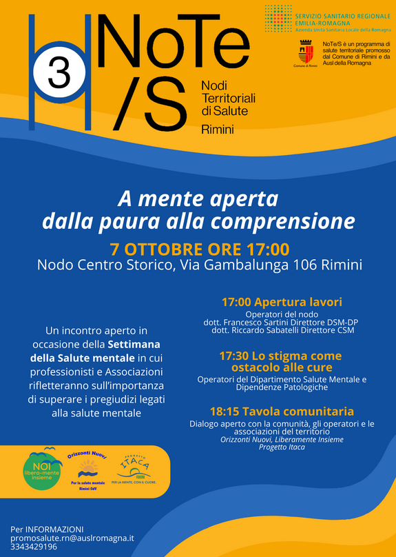 Il primo incontro, “A Mente Aperta – dalla Paura alla Comprensione”, si svolgerà martedì 7 ottobre alle ore 17.00 nel Nodo Centro Storico di via Gambalunga 106. Sarà un momento di dialogo partecipato, durante il quale operatori sanitari, comunità e associazioni del territorio affronteranno i temi legati alla salute psicologica, agli stereotipi e al superamento delle barriere culturali che ancora accompagnano il disagio mentale.