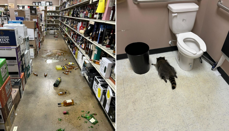 Nel suo girovagare, alcune bottiglie di superalcolici sono cadute e si sono frantumate, spargendo il loro contenuto alcolico sul pavimento. A differenza degli umani, la sua non è stata una scelta di “bere per affogare i dispiaceri”: il procione ha semplicemente leccato il mix di alcolici a terra.