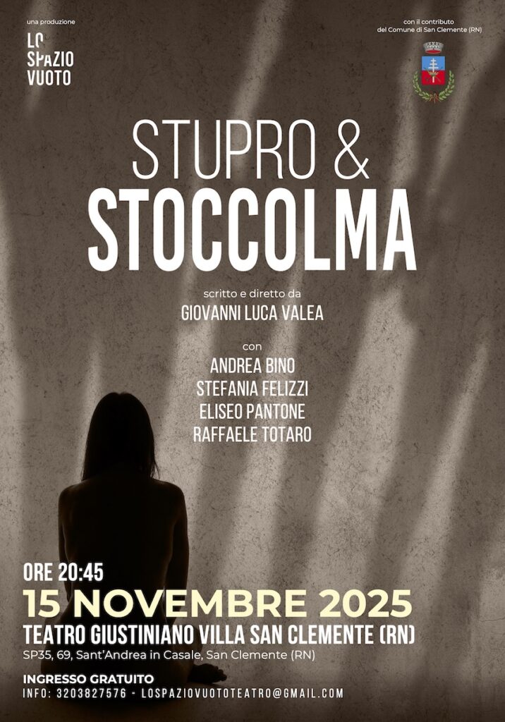 Un’esplorazione cruda e spietata della violenza, della manipolazione psicologica e del sottile confine tra vittima e carnefice. Sabato 15 novembre, alle 20:45, al Teatro Giustiniano Villa di San Clemente va in scena “Stupro & Stoccolma”, la nuova produzione della compagnia Lo Spazio Vuoto. Lo spettacolo, inserito nel programma di iniziative per la Giornata Internazionale contro la violenza sulle donne, affronta il tema della Sindrome di Stoccolma in un devastante scenario di guerra.