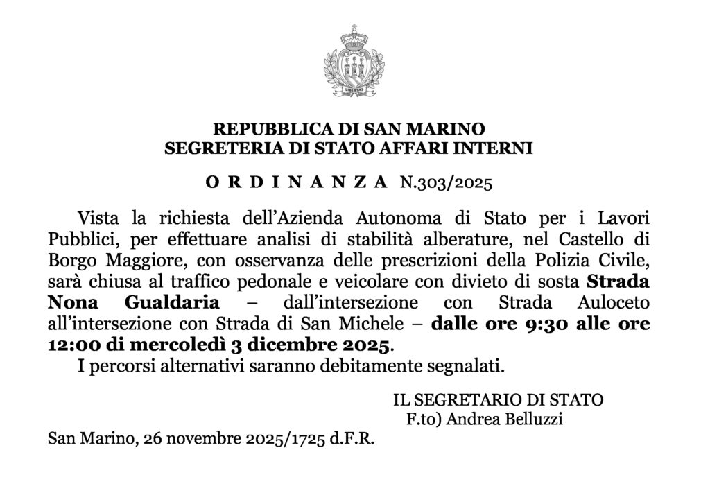 San Marino. AASLP – Chiusura temporanea di Strada Nona Gualdaria – Borgo Maggiore