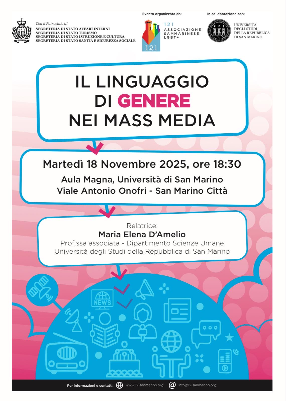 Le parole e le immagini usate ogni giorno dai mass media hanno il potere di modellare la percezione sociale, di dare visibilità o, al contrario, di marginalizzare. Su questo tema cruciale si concentra l’incontro pubblico “Il linguaggio di genere nei mass media”, che si terrà martedì prossimo, 18 novembre, alle 18:30 nell’Aula Magna dell’Università di San Marino. A guidare la riflessione sarà Maria Elena D’Amelio, professoressa associata del Dipartimento di Scienze Umane dell’ateneo sammarinese.