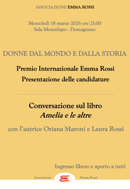 A seguire, si terrà una Conversazione pubblica a partire dal romanzo “Amelia e le altre” tra l’Autrice Oriana Maroni, già Direttrice della Biblioteca Gambalunga di Rimini e Laura Rossi, vicepresidente della nostra Associazione.