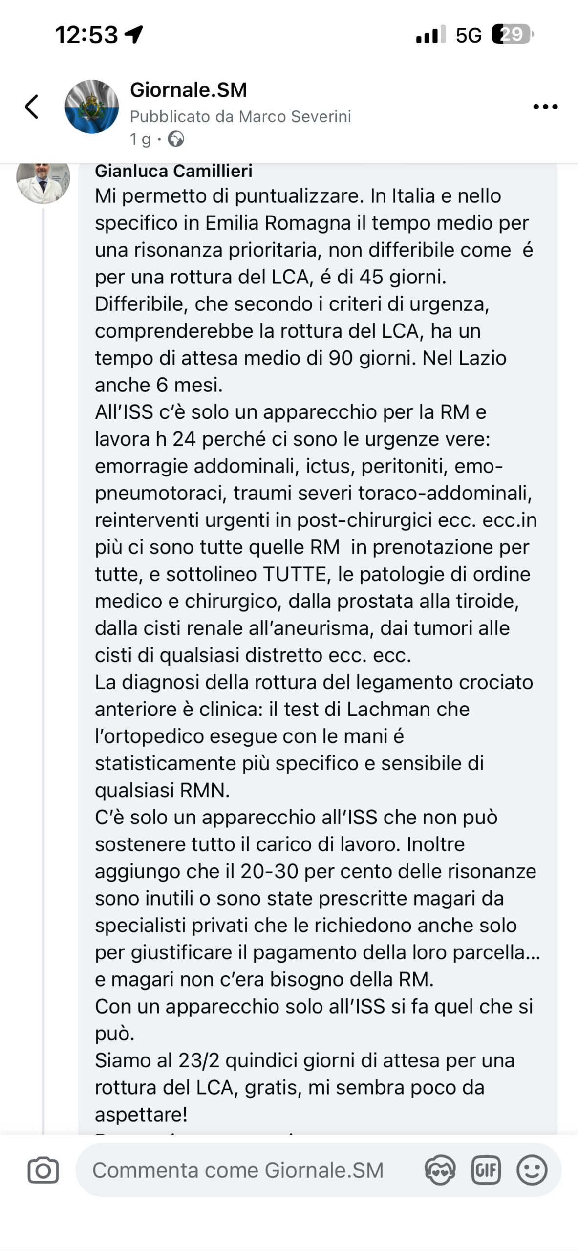 San Marino. Attesa all’Iss di 3 settimane per una risonanza urgente di un crociato rotto contro 3 giorni alla Gemini. Dott. Camillieri: ”abbiamo poche macchine ed in Italia si aspetta di più ”
