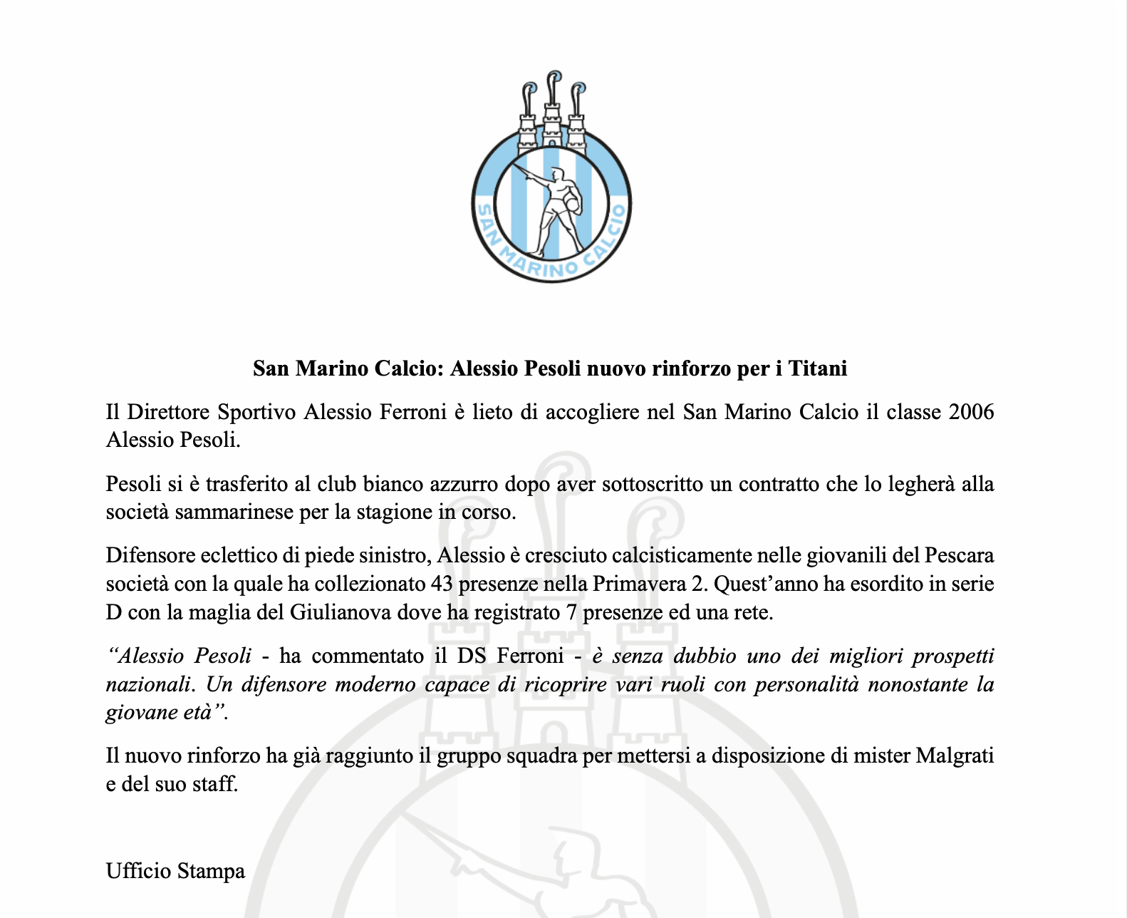 San Marino Calcio. Alessio Pesoli nuovo rinforzo per i Titani