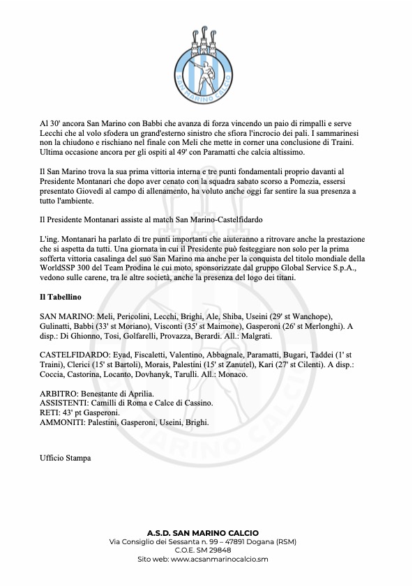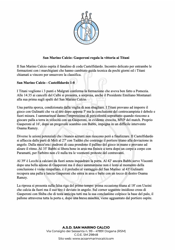 San Marino Calcio: Gasperoni regala la vittoria ai Titani