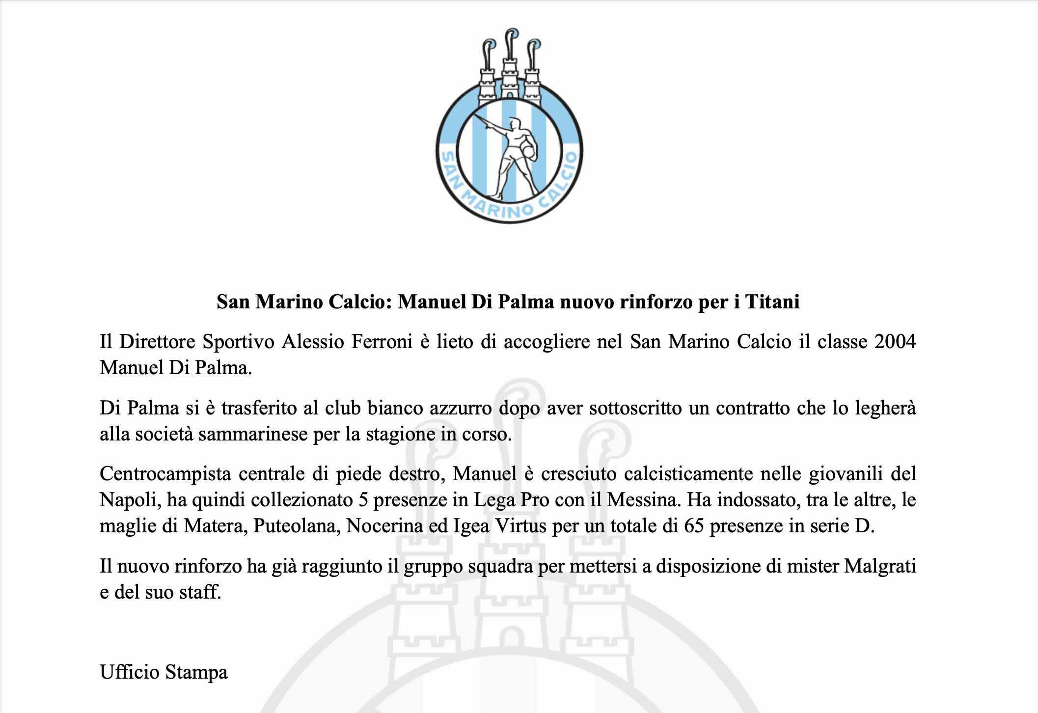 San Marino Calcio. Manuel Di Palma nuovo rinforzo per i Titani