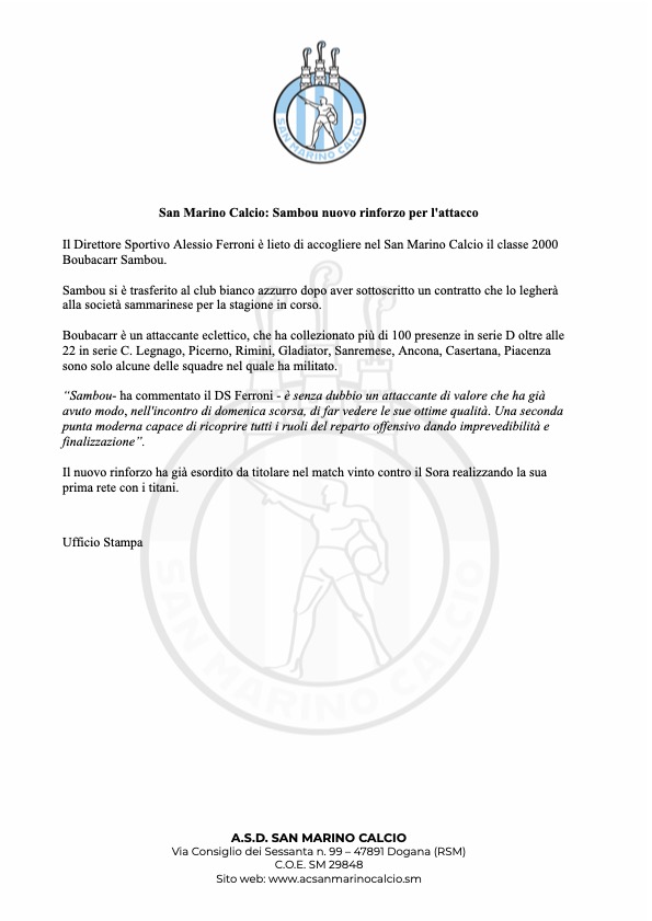 San Marino Calcio: Sambou nuovo rinforzo per l’attacco