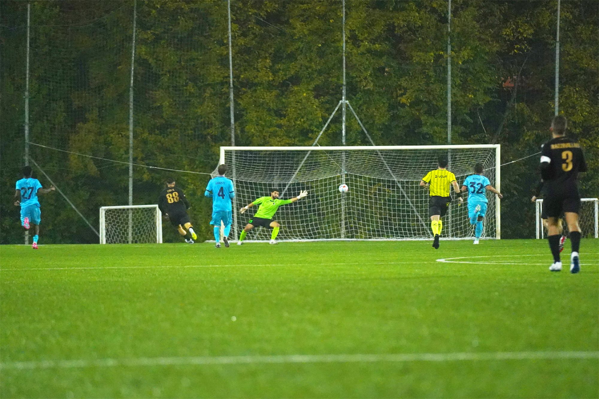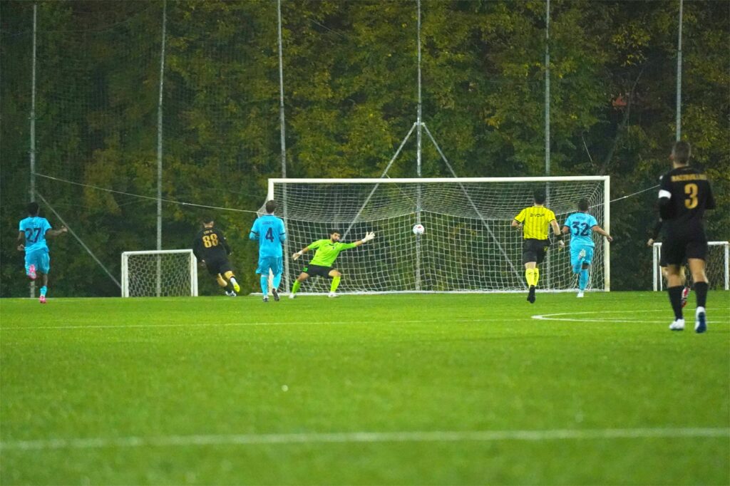 Dall’altra parte, un episodio decisivo al 28’: Faetanini atterra Giacomo Borghini in area e l’arbitro indica il dischetto. Dagli undici metri, al 29’, Benedetti è glaciale: conclusione precisa e 1-0 Juvenes Dogana.