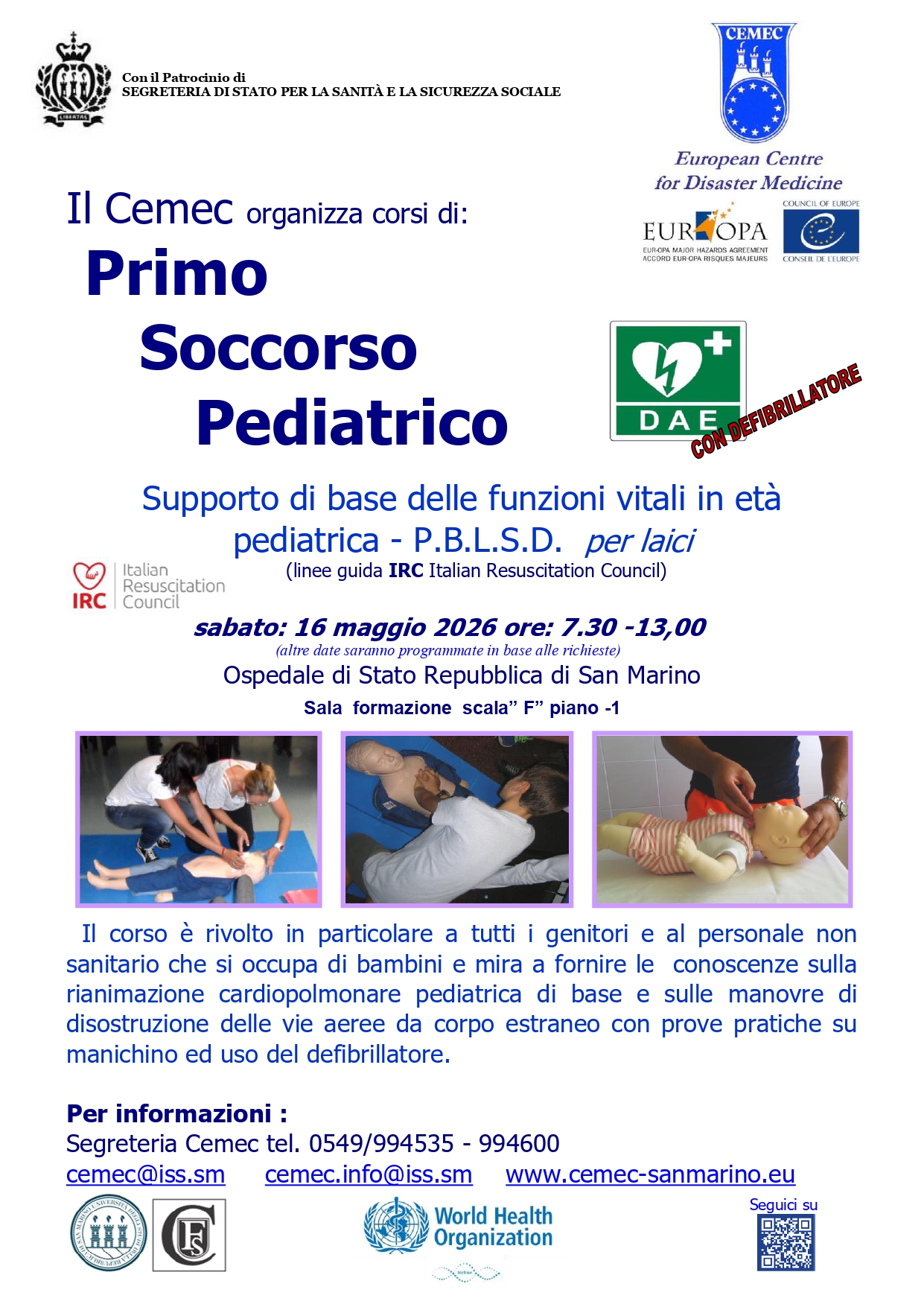 San Marino. Cemec: Corso di Primo Soccorso Pediatrico con utilizzo del Defibrillatore, destinato a tutta la popolazione Sammarinese e Italiana. Sabato 16 maggio 2026 ore: 7.30 -13,00, Ospedale di Stato