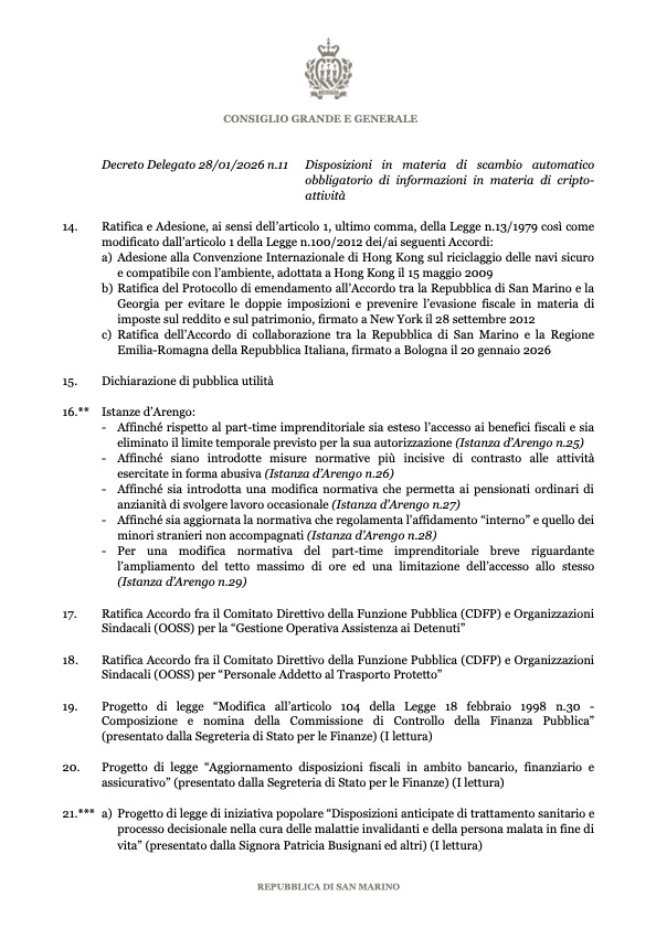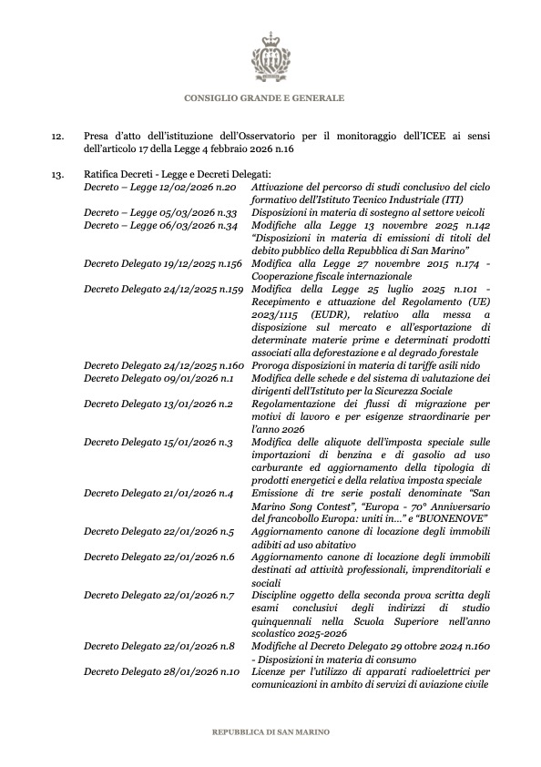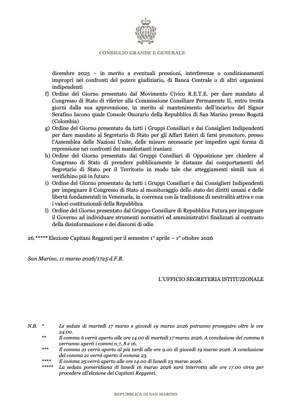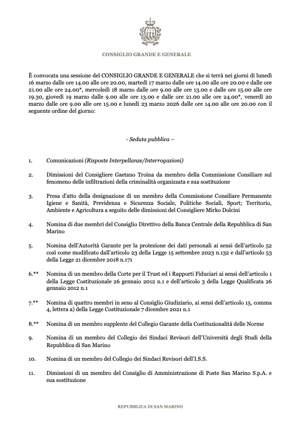 San Marino. Convocato il Consiglio Grande e Generale dal 16 al 23 marzo 2026