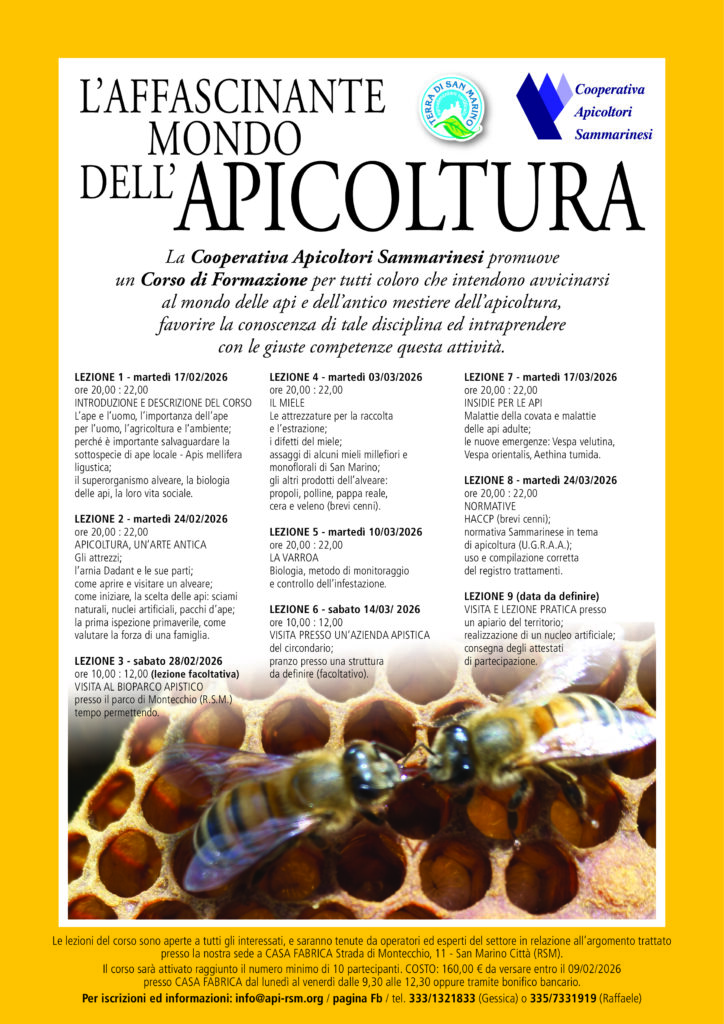 San Marino. Corso dal titolo:” l’affascinante mondo dell’apicoltura” presso Casa Fabrica, da martedì 17 febbraio 2026