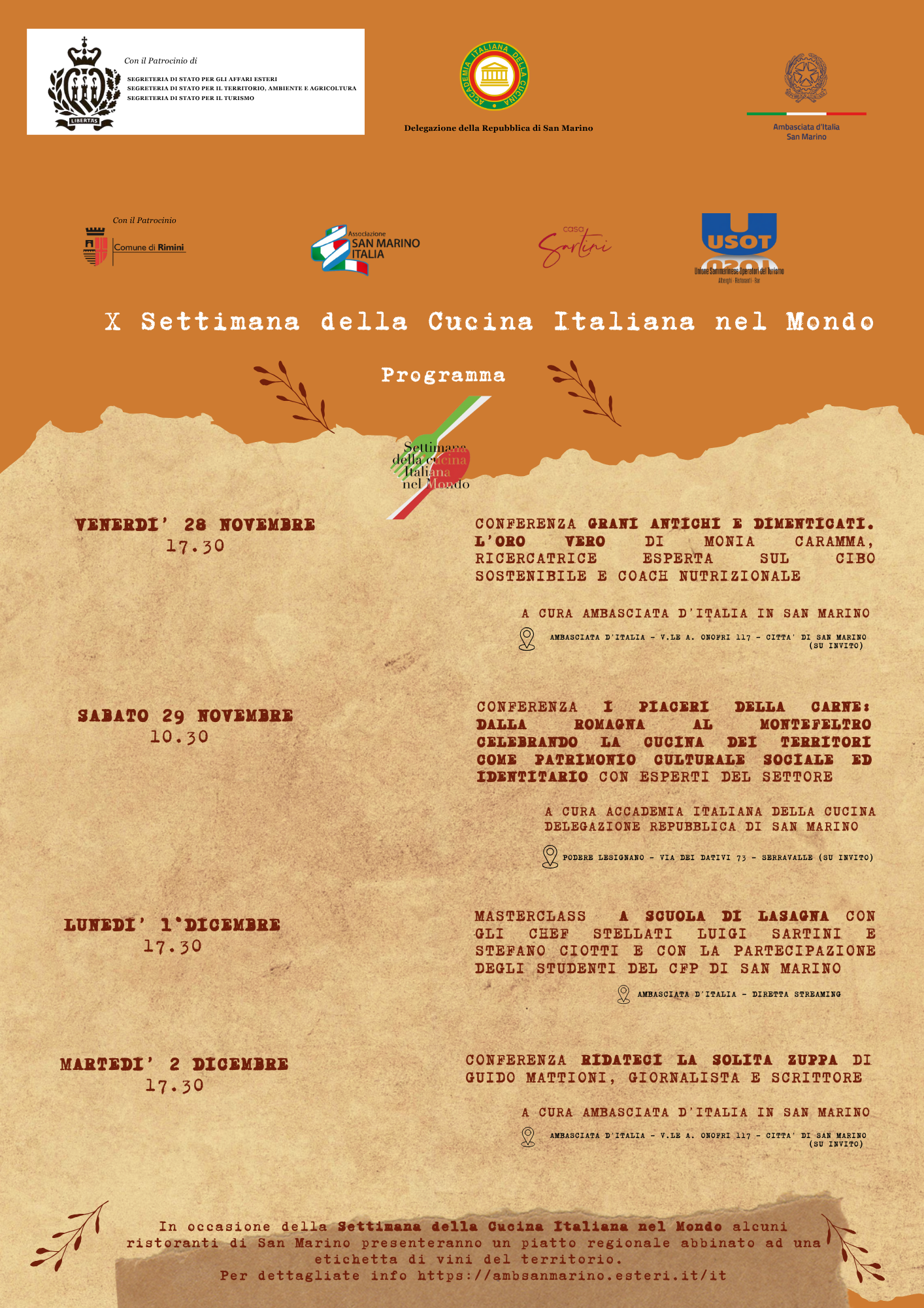 L’iniziativa, promossa dall’Ambasciata d’Italia a San Marino in sinergia con l’Accademia Italiana della Cucina, le Segreterie di Stato e numerose associazioni di categoria, propone quest’anno un calendario ricco non solo di degustazioni, ma anche di dibattiti culturali e approfondimenti su salute e sostenibilità.