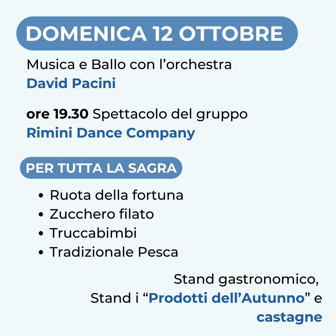 La giornata conclusiva, domenica 12 ottobre, sarà dedicata come da tradizione alla musica dal vivo e al ballo popolare. Dalle ore pomeridiane fino a tarda sera, salirà sul palco l’Orchestra David Pacini, seguita alle 19.30 dal Grande Spettacolo della Rimini Dance Company, protagonisti di una serata all’insegna dell’energia e della danza.