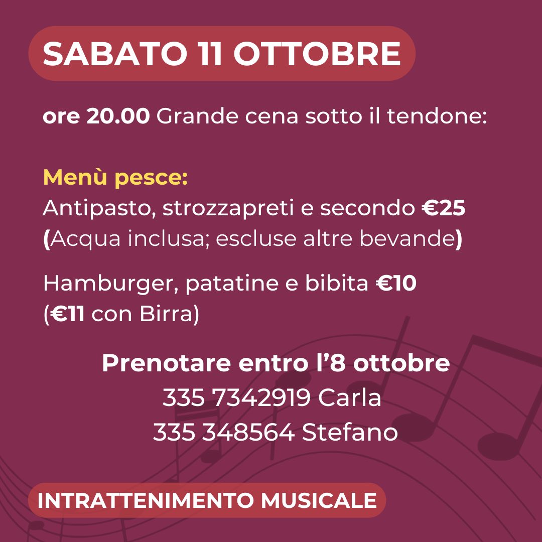 Per partecipare alla cena è consigliata la prenotazione entro l’8 ottobre ai numeri 335 7342919 (Carla) o 335 348564 (Stefano). La serata proseguirà con l’intrattenimento musicale di Elisa, per un sabato di musica e buonumore.