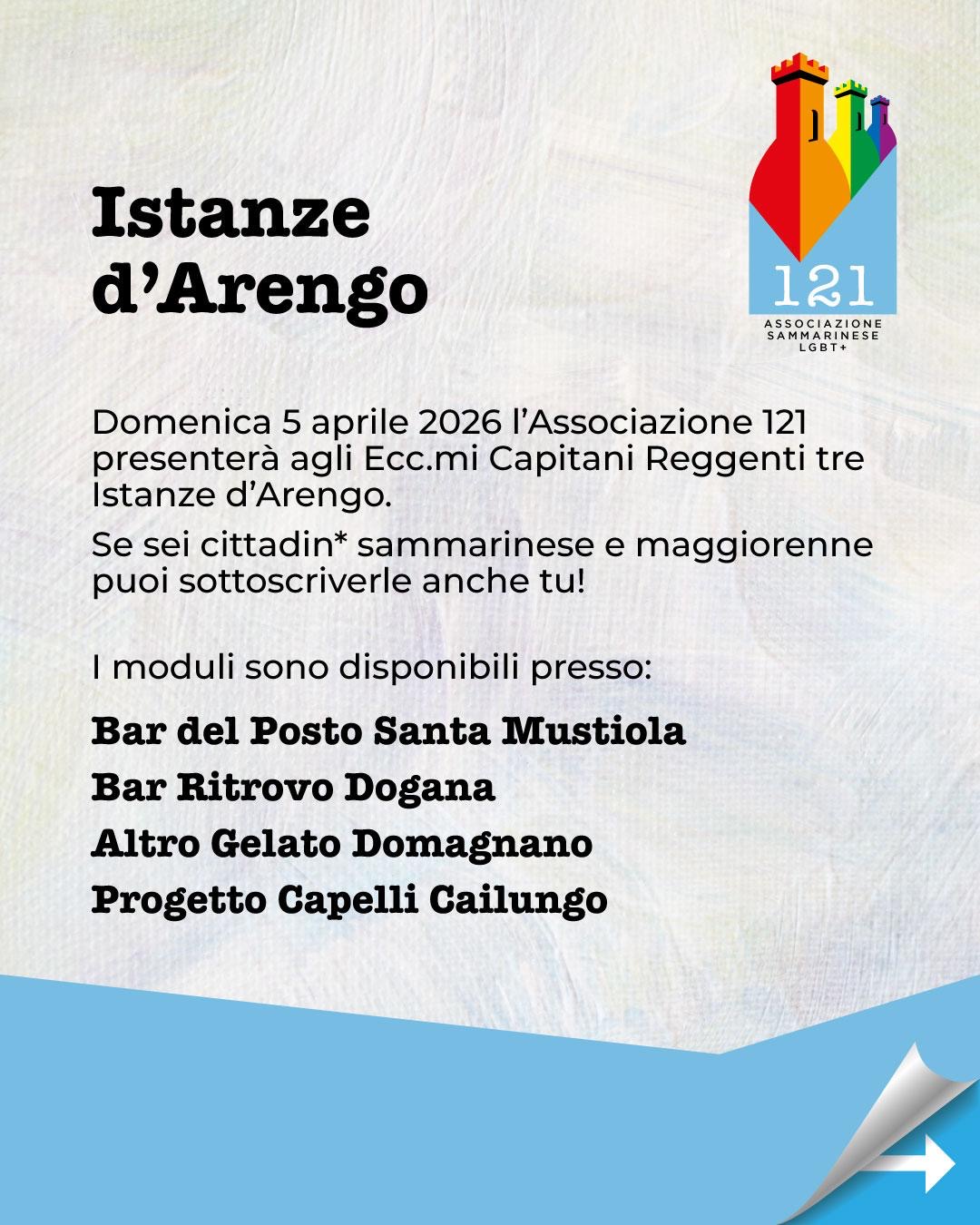 L’Associazione 121 ha dato il via a una campagna di raccolta firme per tre Istanze d’Arengo che saranno presentate il prossimo 5 aprile agli Eccellentissimi Capitani Reggenti. L’iniziativa punta a introdurre riforme significative su temi sensibili come il riconoscimento dell’identità di genere e i diritti delle famiglie omogenitoriali, con l’obiettivo di rendere la Repubblica di San Marino uno Stato più inclusivo e attento alle tutele dei minori e della dignità personale.