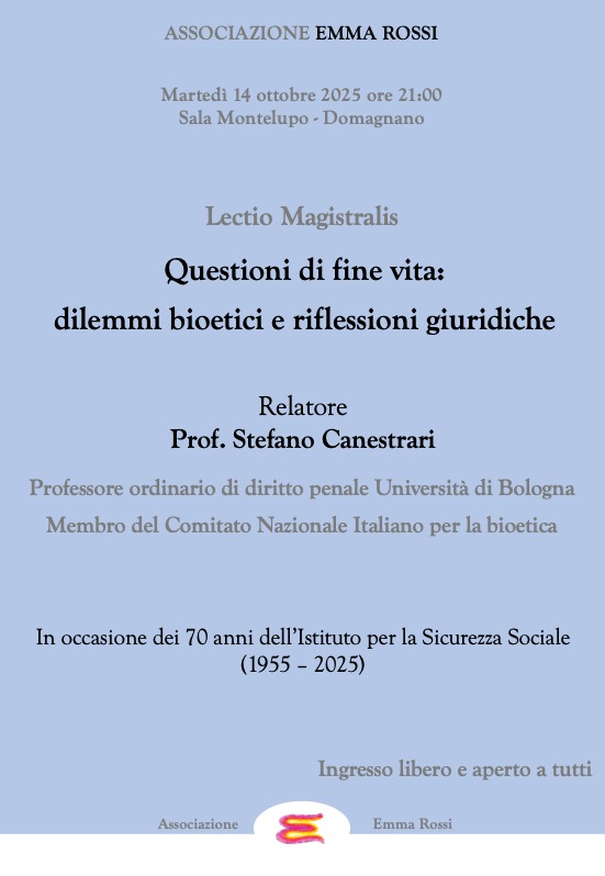 L’Associazione Emma Rossi organizza martedì 14 ottobre, alle ore 21.00 nella Sala Montelupo di Domagnano, una conferenza dal titolo “Questioni di fine vita: dilemmi bioetici e riflessioni giuridiche”.