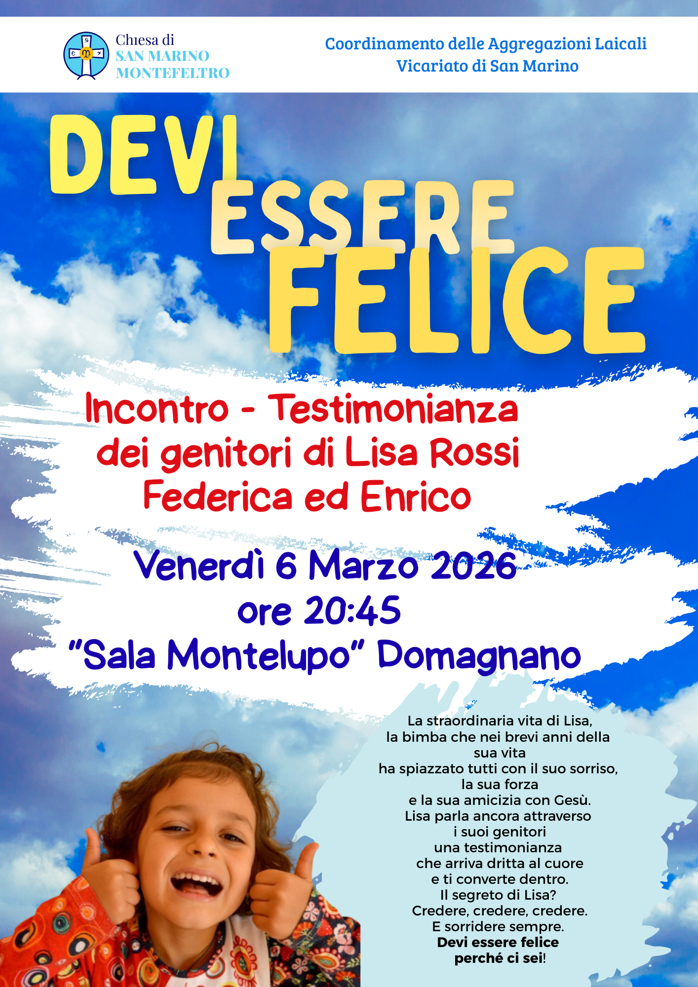 In un momento storico segnato da incertezze e instabilità internazionale, il territorio di San Marino si prepara ad accogliere un messaggio di speranza e positività che nasce da una storia di vita profonda e toccante. Venerdì 6 marzo, alle ore 20:45, la Sala Montelupo di Domagnano ospiterà l’incontro-testimonianza dei genitori di Lisa Rossi, Federica ed Enrico, dal titolo evocativo: “Devi essere felice”.