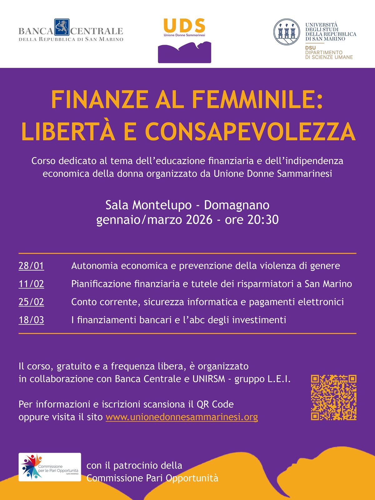 Prosegue il percorso di “Finanze al Femminile: Libertà e Consapevolezza”, l’iniziativa promossa da Unione Donne Sammarinesi per promuovere l’indipendenza economica come strumento di emancipazione. L’appuntamento è per mercoledì 11 febbraio, alle ore 20.30, presso la Sala Montelupo di Domagnano.