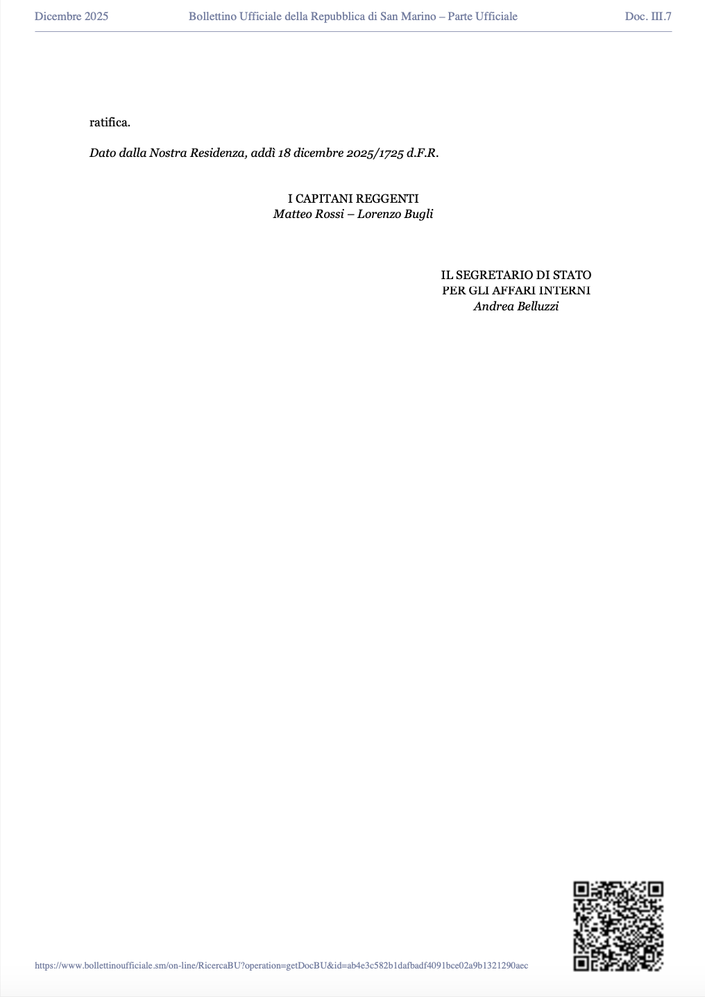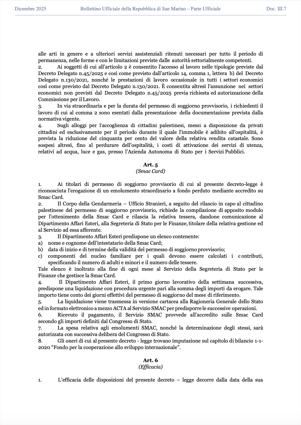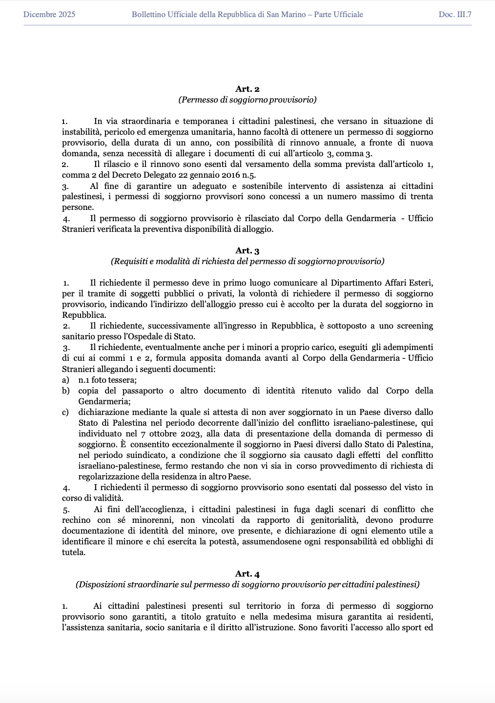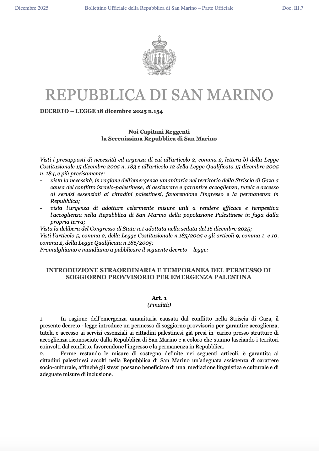 San Marino. Ecco il DECRETO LEGGE d’urgenza – 18 dicembre 2025 n.154 – ACCOGLIMENTO PALESTINESI