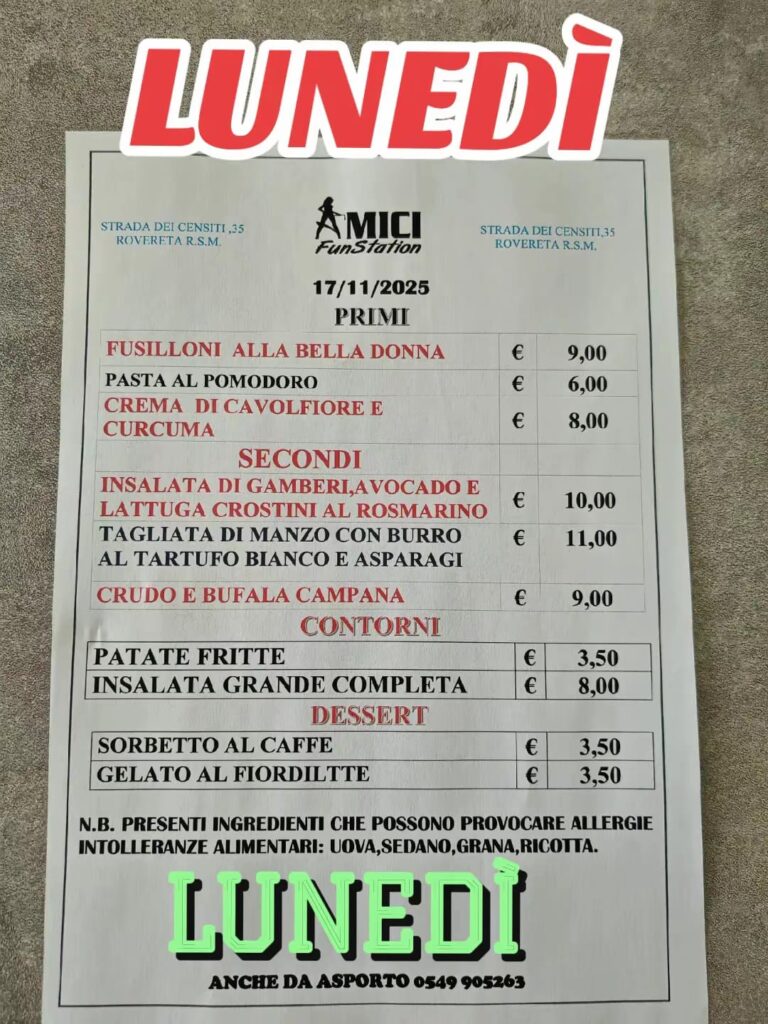 San Marino. Ecco il menù di oggi di AMICI FUN STATION