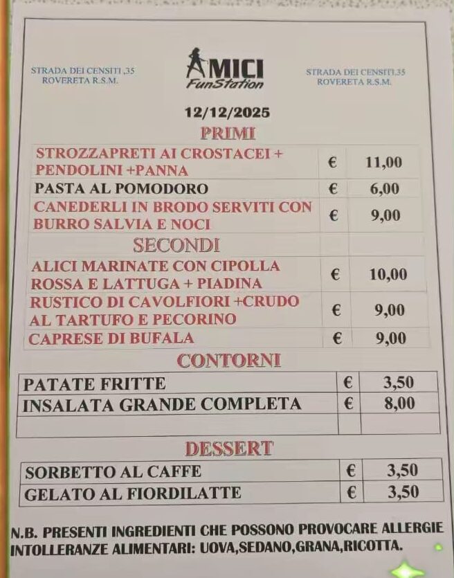 San Marino. Ecco il menù di oggi di AMICI FUN STATION