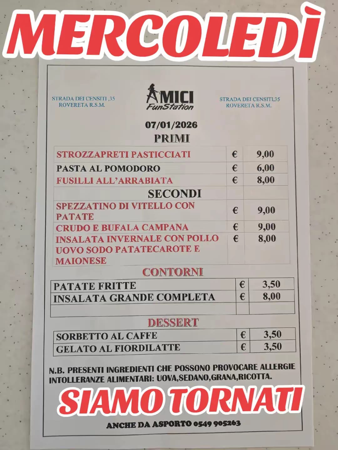 San Marino. Ecco il menù di oggi di AMICI FUN STATION