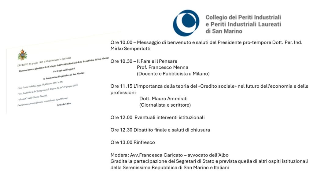 L’Albo dei Periti Industriali e Periti Industriali Laureati della Serenissima Repubblica di San Marino comunica che i festeggiamenti per il trentennale dell’Albo si terranno il 17 gennaio 2026 posticipandolo rispetto alla data effettiva di fondazione per via delle numerose festività che si sono succedute da giugno scorso ad oggi. Sarà un’occasione di incontro con la cittadinanza interessata e di dibattito politico-culturale.