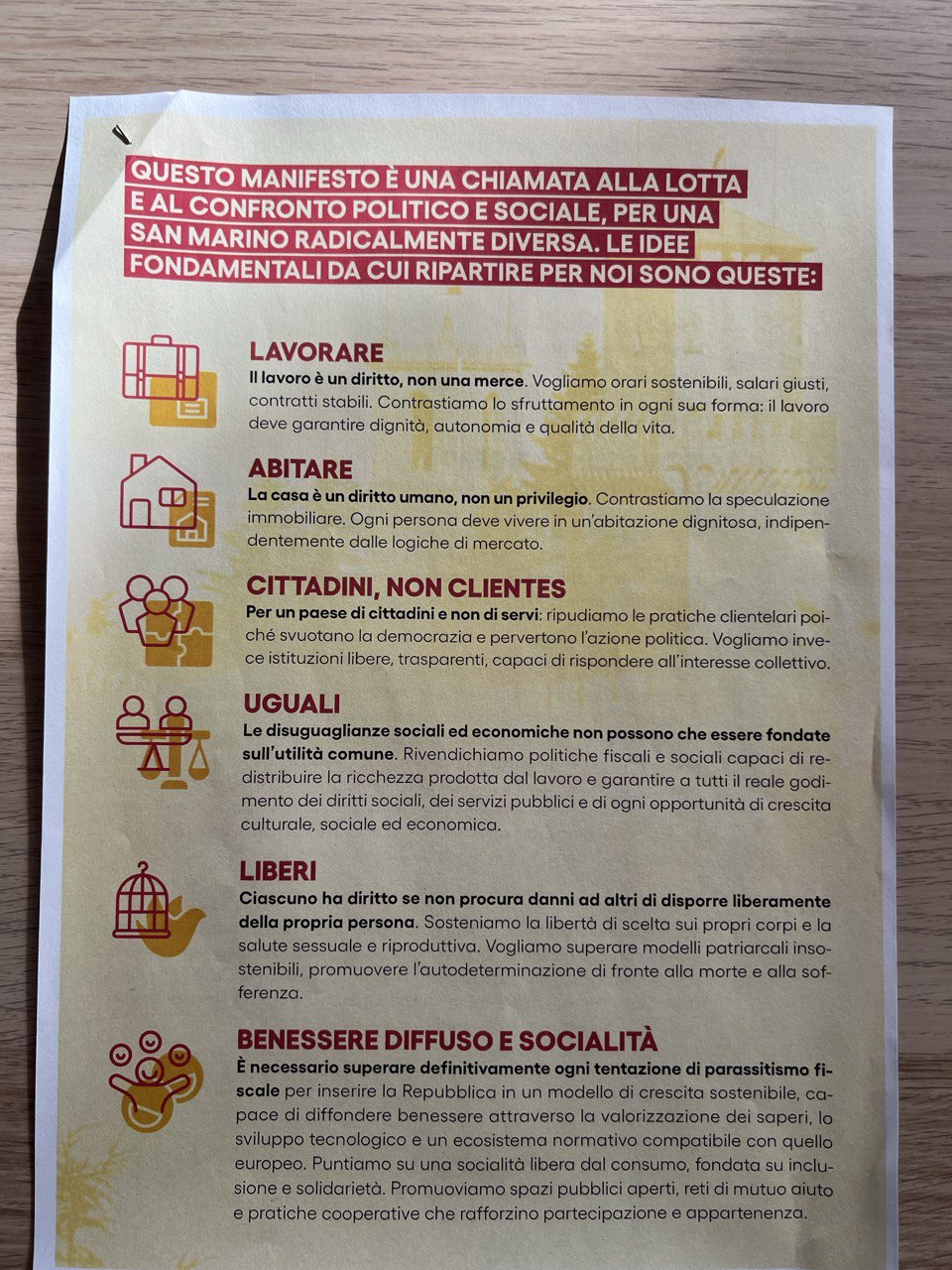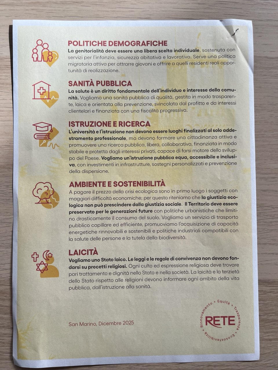 San Marino. FLASH. Rete presenta il manifesto, con priorità identità, sinistra dichiarata e continuità politica (gli articoli domani mattina)