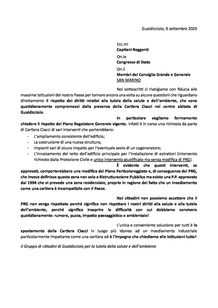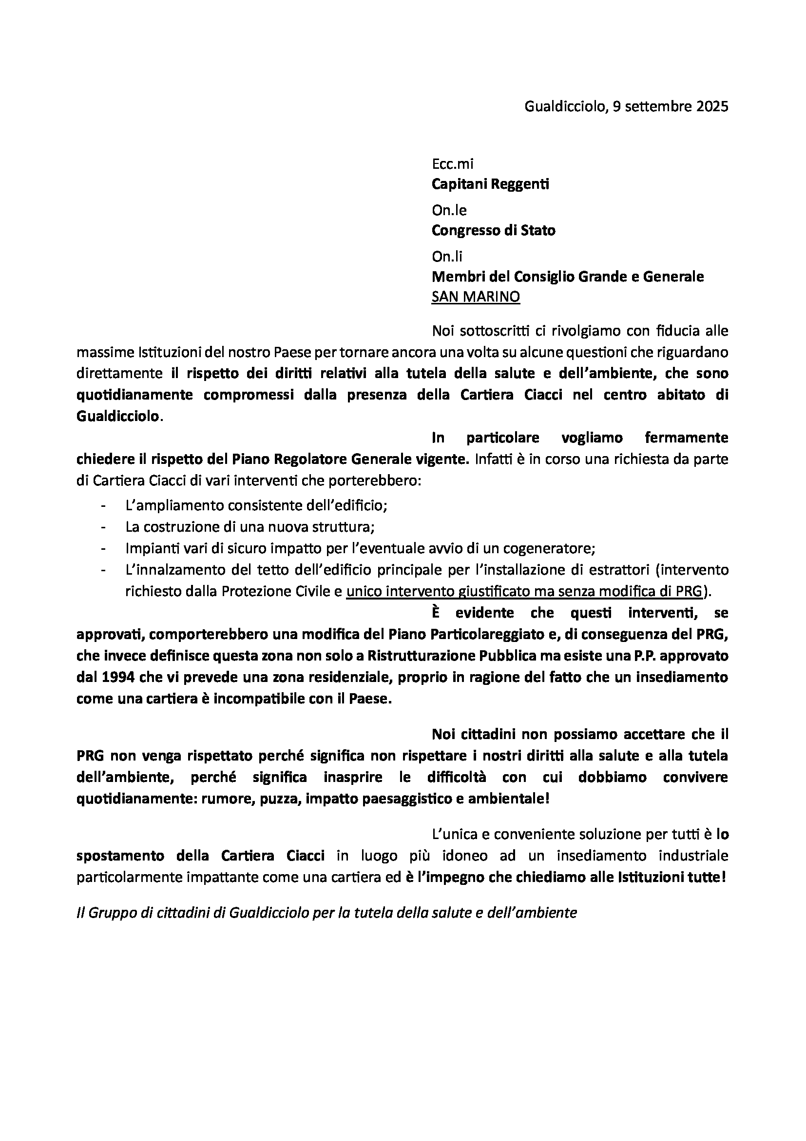 A nome del Gruppo di cittadini di Gualdicciolo per la difesa della salute e dell’ambiente si allega Petizione consegnata alla Ecc.ma Reggenza, al Congresso di Stato e al Consiglio Grande e Generale sostenuta e firmata da circa 400 cittadini.