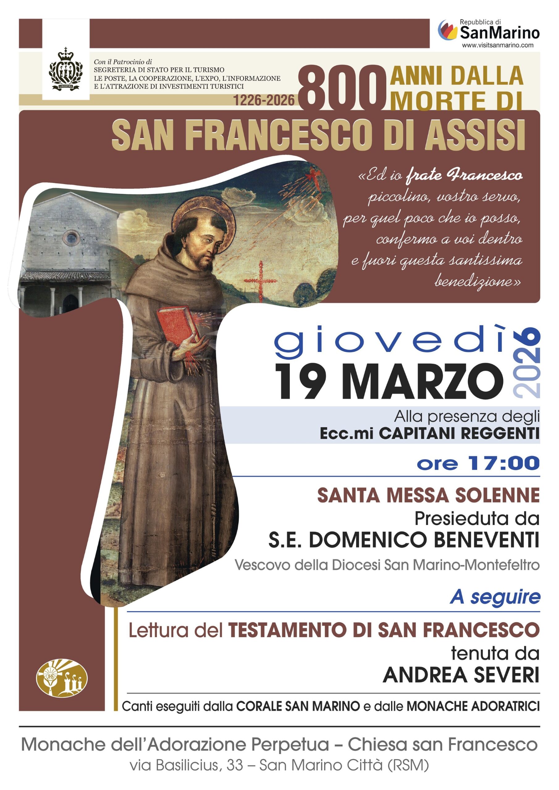 Al termine della Santa Messa è previsto un momento artistico e spirituale. Nel pieno rispetto della tradizione francescana, Andrea Severi eseguirà la lettura del Testamento di San Francesco. I canti saranno invece affidati alla Corale San Marino e alle Monache dell’Adorazione Perpetua.
