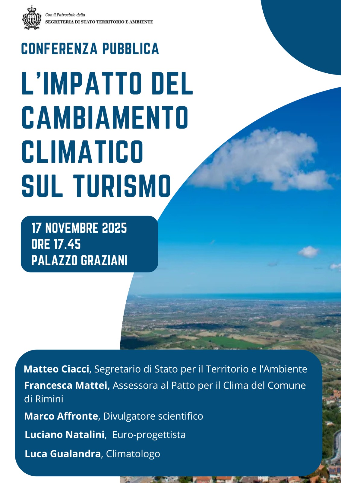 L’erosione delle spiagge, le ondate di calore sempre più estreme e l’innalzamento del mare stanno già cambiando il volto del turismo balneare e l’economia delle coste. Per analizzare queste sfide e disegnare un futuro sostenibile, lunedì prossimo, 17 novembre, a Palazzo Graziani verrà presentato il volume “L’impatto del cambiamento climatico sul turismo balneare”. L’evento, che inizierà alle 17:45, vedrà la partecipazione degli autori, di esperti e del Segretario di Stato per il Territorio, Matteo Ciacci.