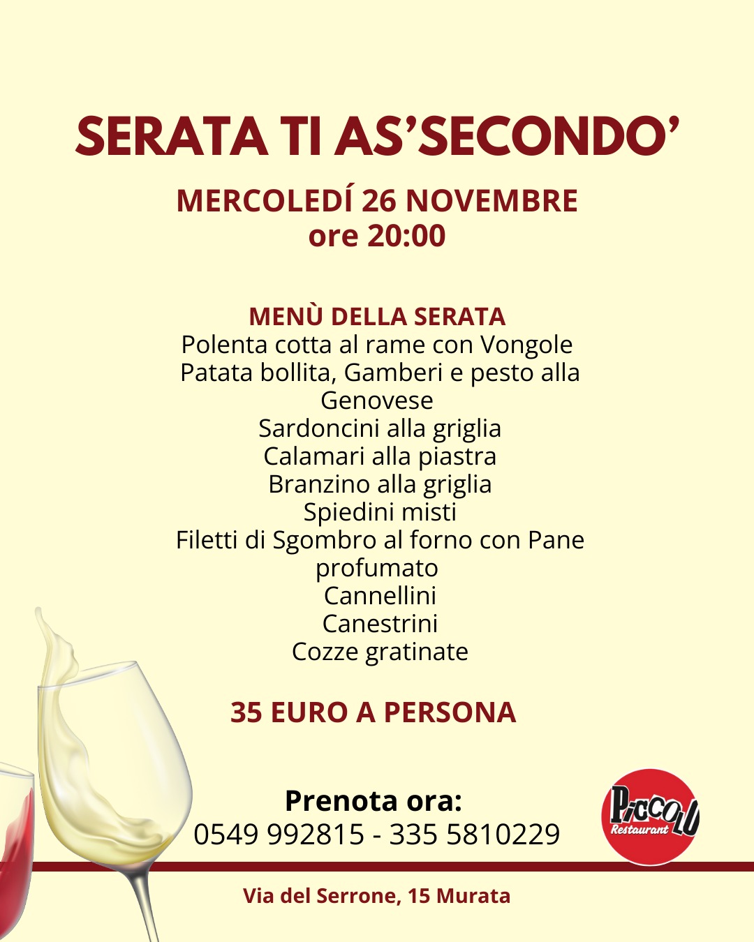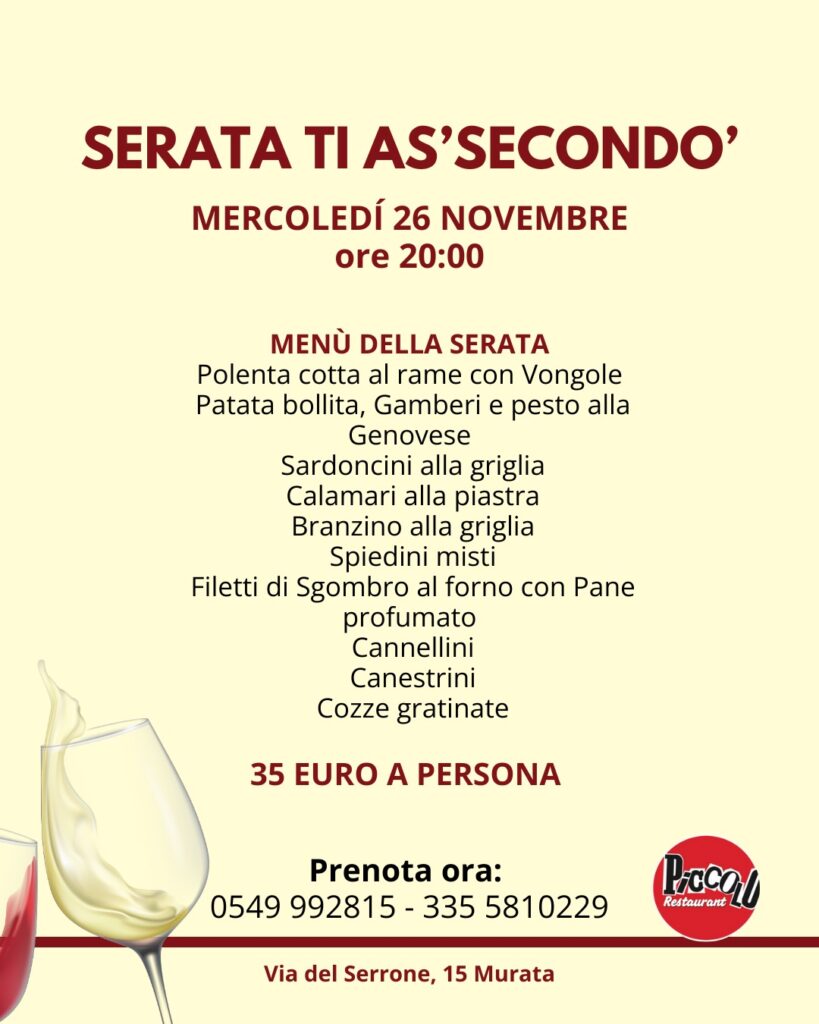 San Marino. Il Piccolo Restaurant: “Serata Ti As’secondo’. Mercoledì 26 novembre, ore 20.00