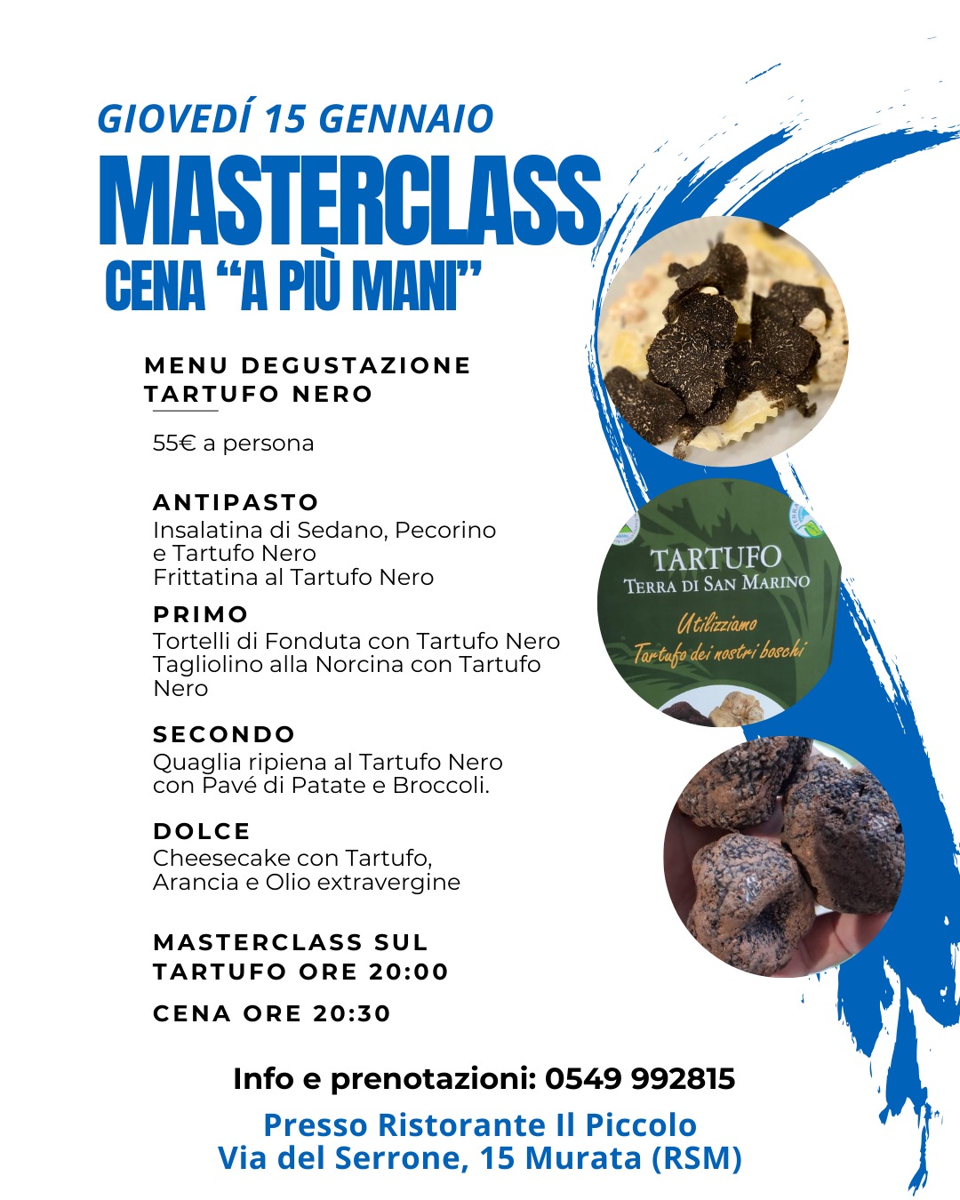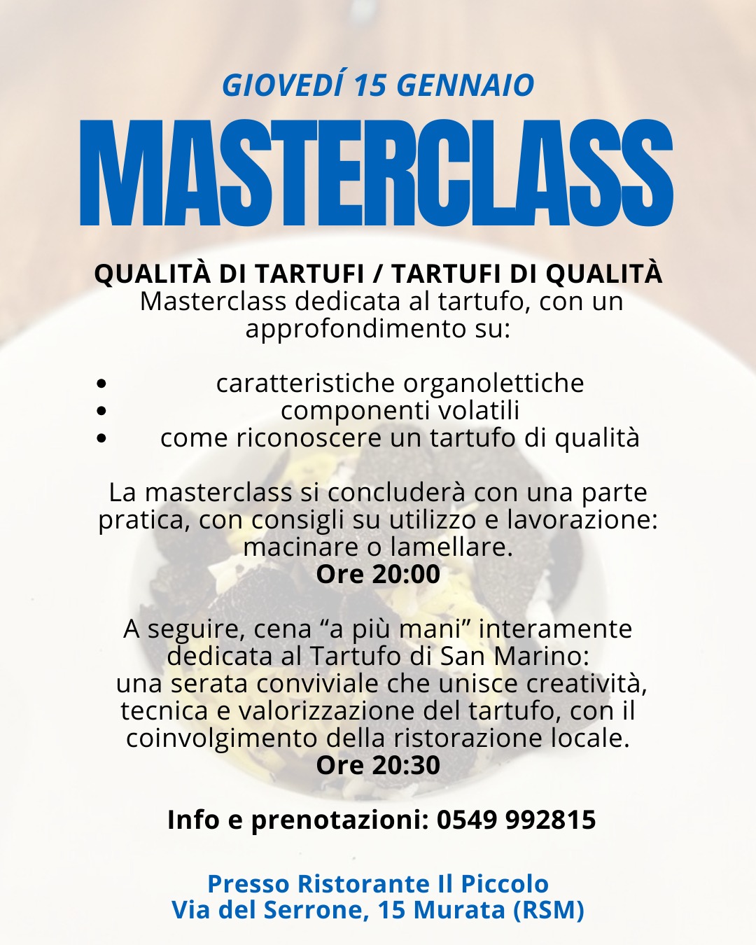 Un viaggio alla scoperta del tartufo nero sammarinese, tra analisi sensoriale e alta cucina. È quanto propone l’evento in programma per giovedì 15 gennaio nella Repubblica di San Marino, una serata concepita per valorizzare uno dei prodotti più pregiati del territorio attraverso un percorso didattico e gastronomico.