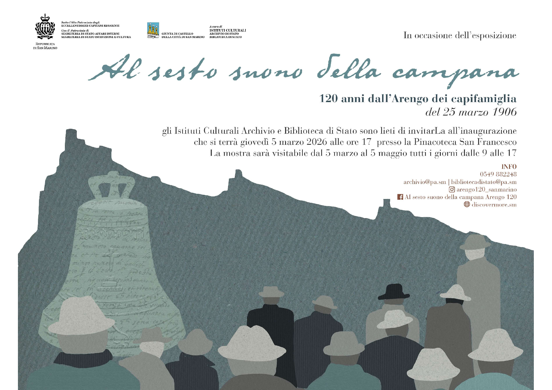 A centoventi anni dall’Arengo del 25 marzo 1906, la Sezione Archivio e Biblioteca di Stato – Istituti Culturali di San Marino, in collaborazione con i Musei di Stato, propone la mostra “Al sesto suono della campana”, un percorso espositivo dedicato a uno dei passaggi più decisivi della storia istituzionale Sammarinese. L’inaugurazione, ad ingresso libero, è fissata per domani 5 Marzo 2026 alle ore 17, alla presenza degli Ecc.mi Capitani Reggenti e del Segretario di Stato alla Cultura.