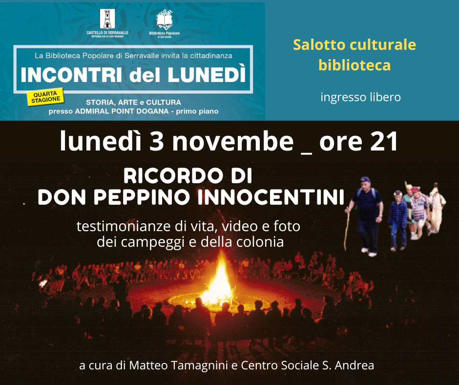 Lunedì 3 novembre prossimo (ore 21) ci sarà un’altra serata importante per la nostra storia e in particolare per la comunità di Serravalle, con il ricordo del carissimo e amato don Giuseppe Innocentini, per tutti don Peppino! L’amico Matteo Tamagnini, del Centro Sociale Sant’Andrea di Serravalle, ci presenterà la figura di don Peppino attraverso immagini dei primi campeggi negli anni ’50 del secolo scorso e della Colonia di Chiusi della Verna, proponendo testimonianze di vita, aneddoti e delle numerose iniziative poste in atto fin dai tempi del suo arrivo a Serravalle.