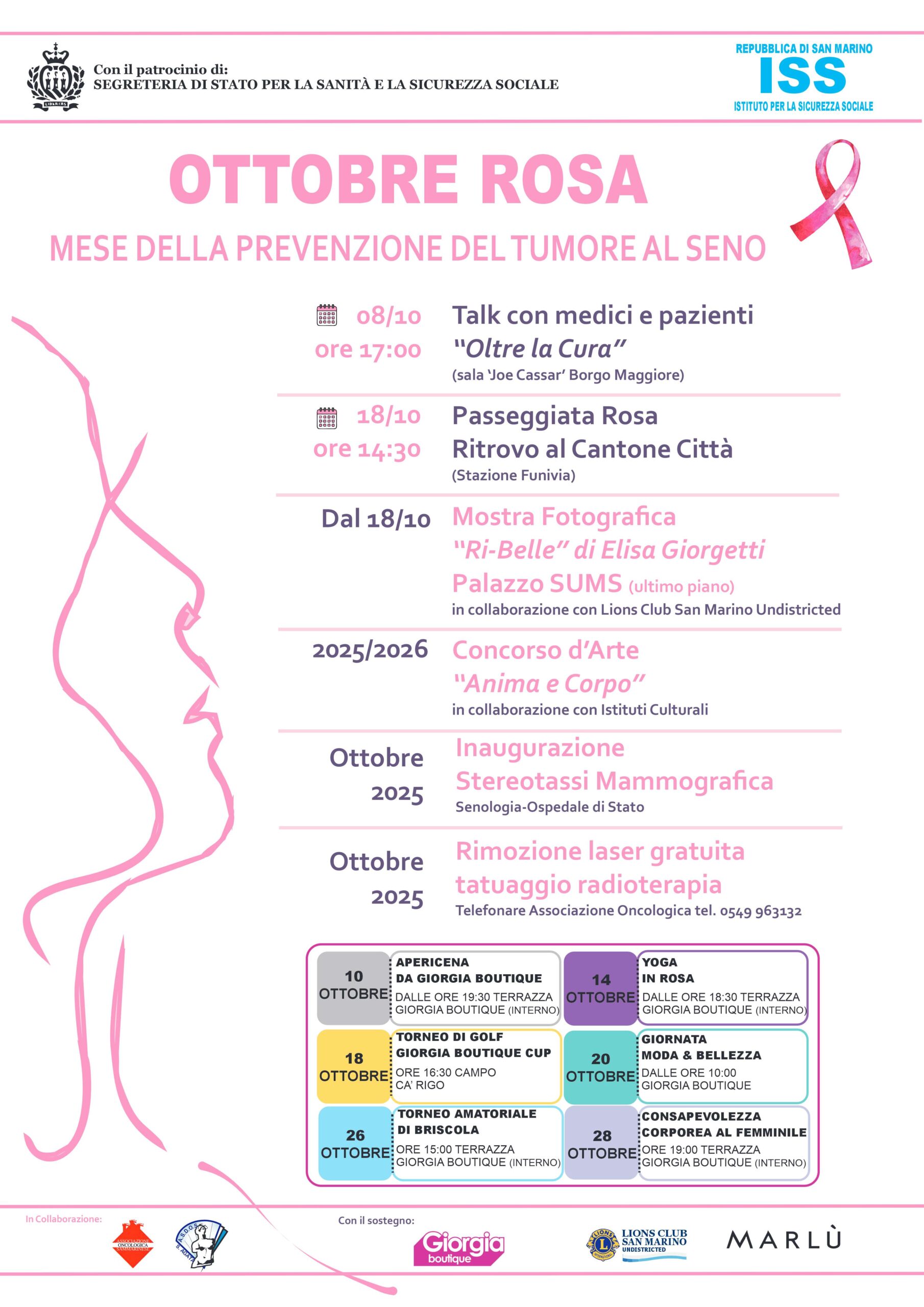 Le iniziative per l’#ottobrerosa sono organizzate dall’Istituto per la Sicurezza Sociale, in particolare dalle UO Radiologia, Oncologia, Chirurgia, Formazione-Comunicazione-URP e dalla Breast Unit assieme all’Associazione Oncologica Sammarinese e all’Associazione Sammarinese Donne Operate al Seno. L’iniziativa ha ricevuto il sostegno di Marlù e Giorgia Boutique quali main sponsor e del Lions Club San Marino Undistricted. Le iniziative dell’Ottobre Rosa 2025 godono del Patrocinio della Segreteria di Stato per la Sanità e la Sicurezza Sociale.