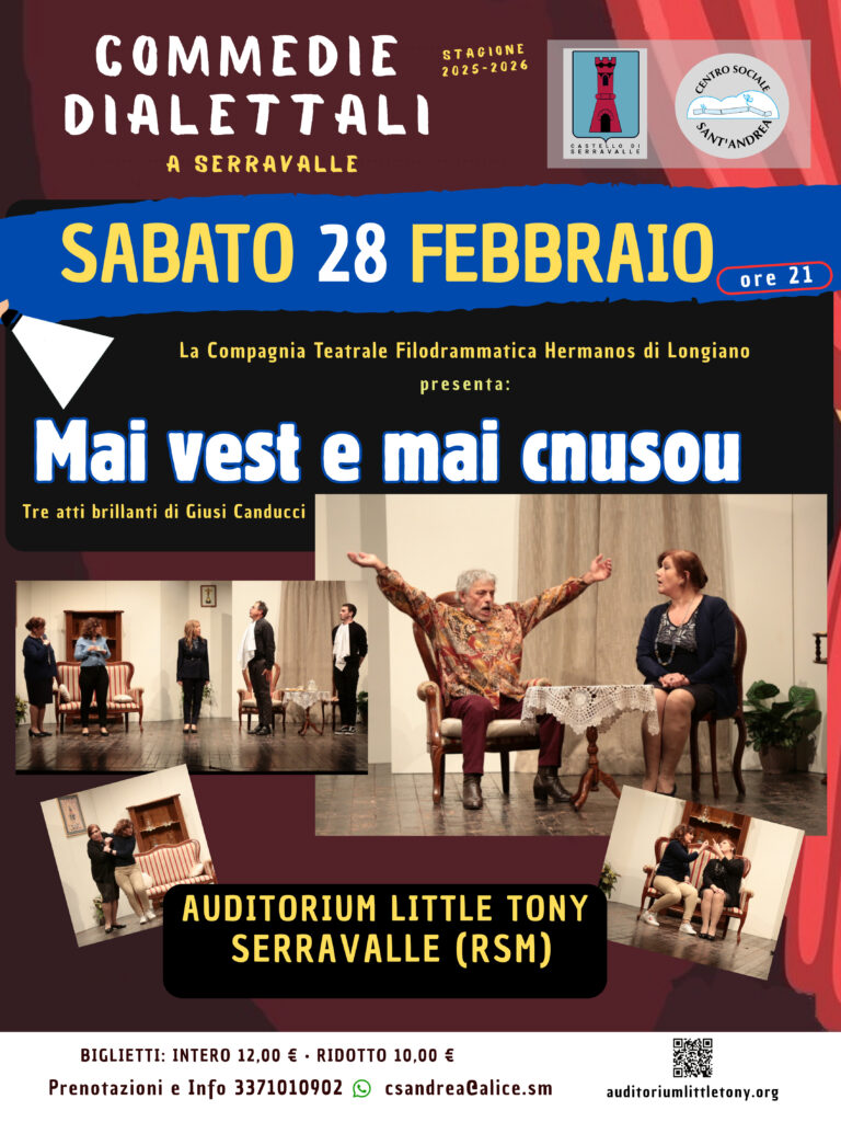 la commedia brillante “Mai vest e mai cnusou” scritta magistralmente da Giusi Canducci, con un intreccio di vicende esileranti che porteranno ad un finale tutto da scoprire.