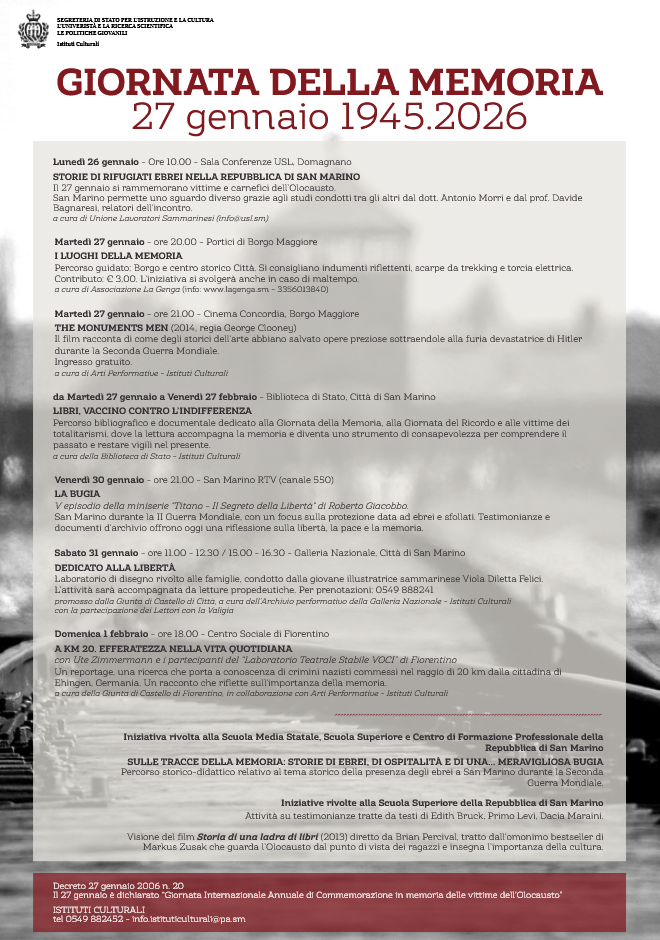 Il giorno simbolo della Memoria sarà scandito da più appuntamenti. In serata, un percorso guidato condurrà i partecipanti tra Borgo Maggiore e il centro storico, trasformando i luoghi in tappe di un racconto collettivo. Camminare diventa così un atto di memoria, un modo per legare lo spazio urbano alla storia e alle sue ferite. Sempre il 27 gennaio, il cinema offrirà una riflessione sul valore della cultura e dell’arte come strumenti di resistenza alla barbarie, con la proiezione di un film che racconta il salvataggio delle opere d’arte europee dalla distruzione nazista.
