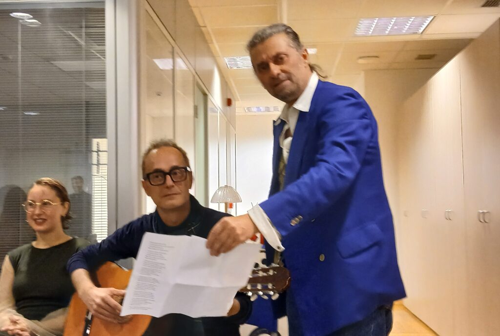 In ordine di presentazione per questo primo mosaico di autori: Marco Guidi, fotografo e scrittore, con il suo libro “Bokeh”, un soft thriller sollecitato da un articolo di cronaca, che ha per protagonista un ipovedente; Alessia Paolini con il “Libro dell’incertezza”, un flusso di coscienza che si pone mille domande ma trova sempre poche risposte; Alessandro Carli, giornalista e scrittore, grande appassionato di teatro e di musica, con il suo “Frammenti di Pangea”, che propone una selezione di suoi articoli. Il quale Carli, rendendo omaggio alla leggerezza della piuma, ha anche imbracciato la chitarra per riproporre “Il gorilla”, una delle canzoni più divertenti e sarcastiche di De André, tra gli applausi sorpresi e calorosi del pubblico.
