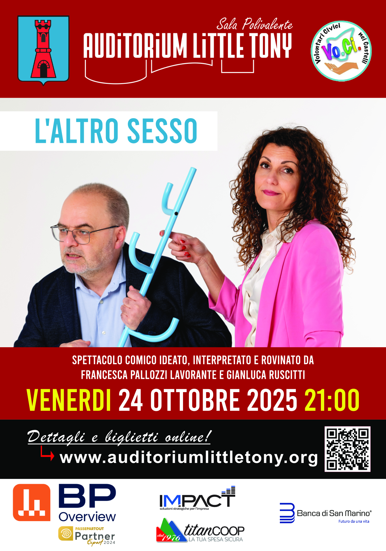 Le incomprensioni, i cliché e i piccoli drammi quotidiani della vita di coppia diventano teatro. Anzi, un mix di stand-up comedy e improvvisazione. Sbarca a San Marino, sul palco dell’Auditorium Little Tony di Serravalle, lo spettacolo “L’Altro Sesso”, che vedrà protagonisti i comici Gianluca Ruscitti e Francesca Pallozzi Lavorante. L’appuntamento, inserito nella rassegna “Occhi sul Teatro 25-26”, e’ fissato per venerdì prossimo, 24 ottobre, alle 21.
