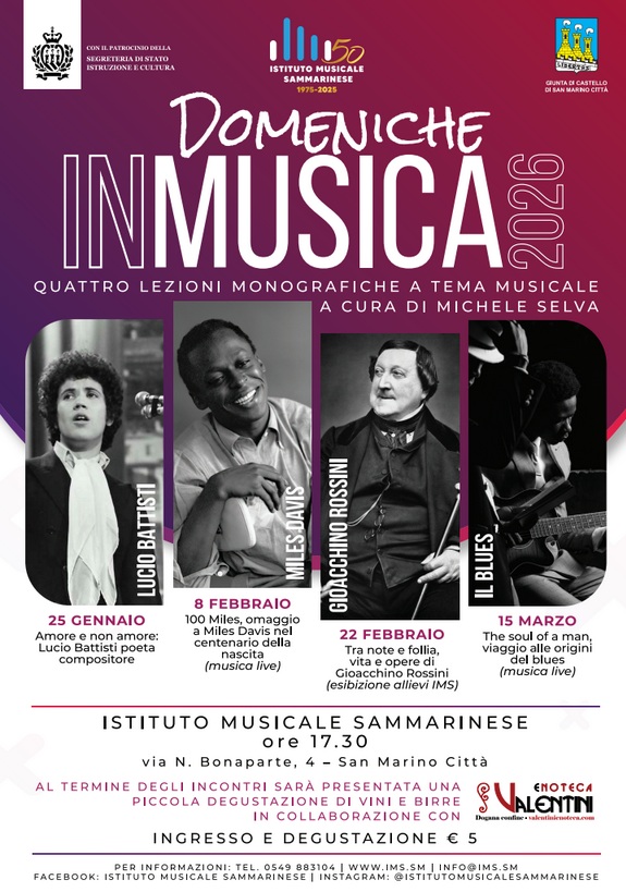 In un comunicato diffuso dall’Istituto Musicale Sammarinese, l’ente ha presentato i dettagli dell’iniziativa, curata e condotta dal professor Michele Selva. L’evento gode del patrocinio della Segreteria di Stato per l’Istruzione e la Cultura e della Giunta di Castello della Città di San Marino.