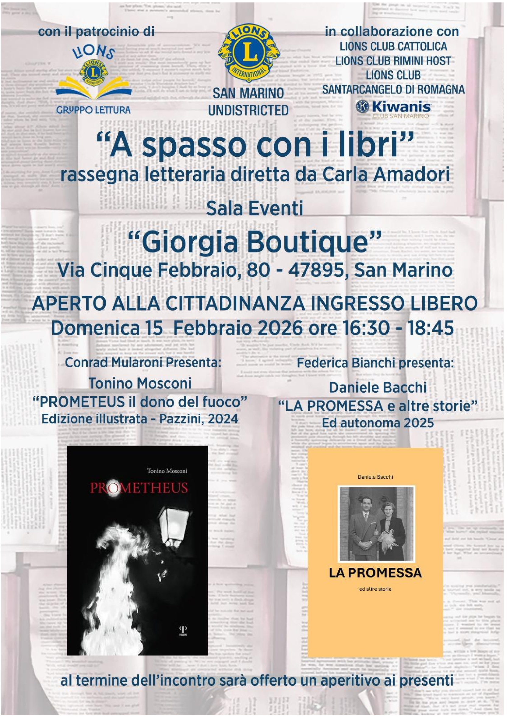 Il Lions Club San Marino Undistricted, in collaborazione con i Lions Club Cattolica, Rimini Host, Santarcangelo di Romagna, il Kiwanis Club San Marino e con il patrocinio del Lions Gruppo Lettura, organizza l’edizione 2026 di “A spasso con i libri” rassegna letteraria diretta da Carla Amadori.