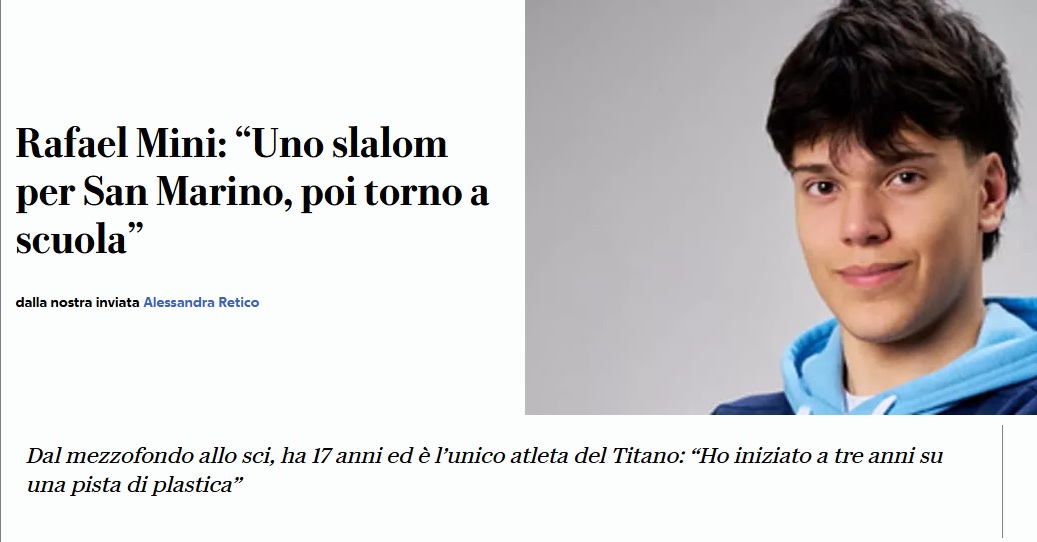 Alla vigilia dell’accensione del braciere olimpico di Milano-Cortina 2026, la Repubblica di San Marino finisce sotto i riflettori della grande stampa italiana. Questa mattina, sfogliando le pagine del quotidiano la Repubblica, i lettori di tutta la penisola si sono imbattuti nel volto pulito e sorridente di Rafael Mini, il diciassettenne portacolori del Titano pronto al debutto ai Giochi Invernali.